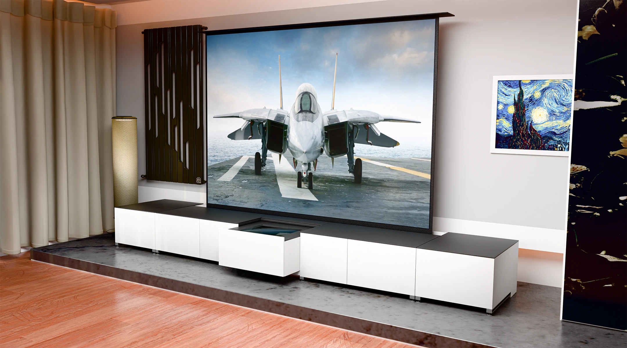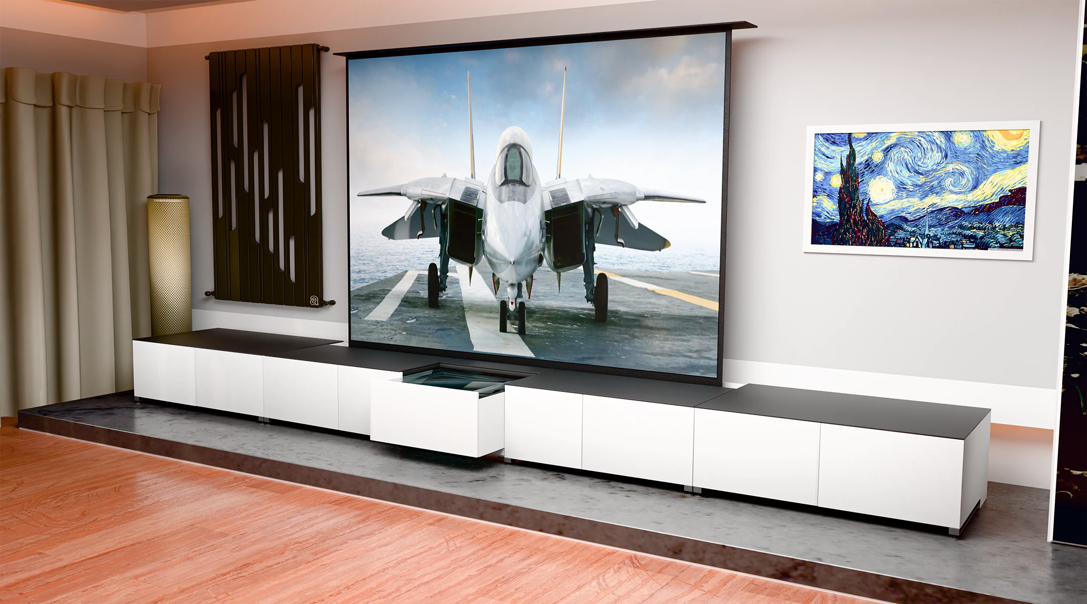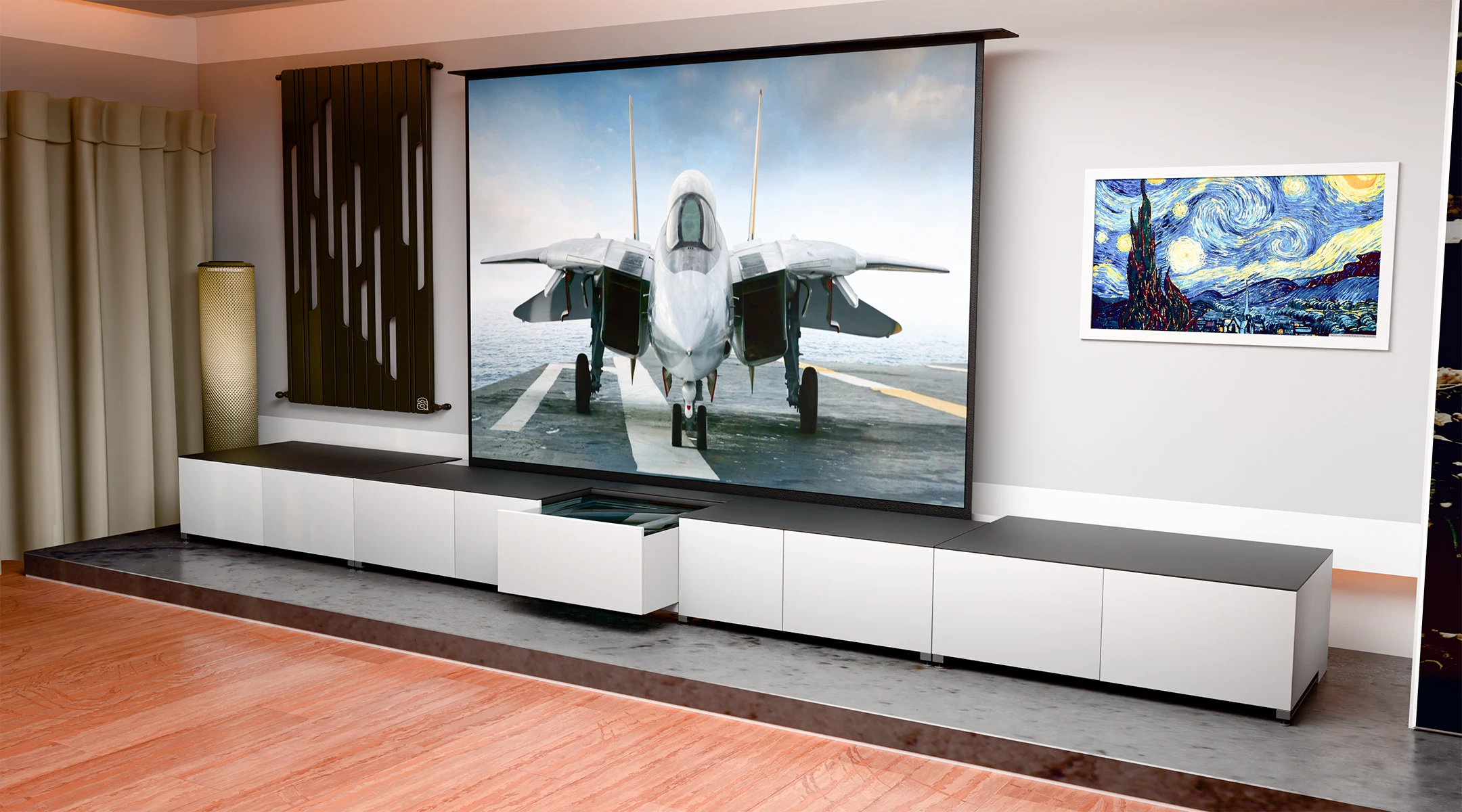 The Ares ust projector cabinet is a work of art. Designed and crafted in our exclusive factory, it’s the original ultra-short throw projector cabinet. There are no imitations—just pure, unmatched luxury. With exquisite attention to detail, Ares redefines the home theater experience. It is built just for you, using the best materials and the most impeccable finish. Every aspect of our media console cabinet speaks to your exceptional taste.Why Choose a Short Throw Projector Stand?