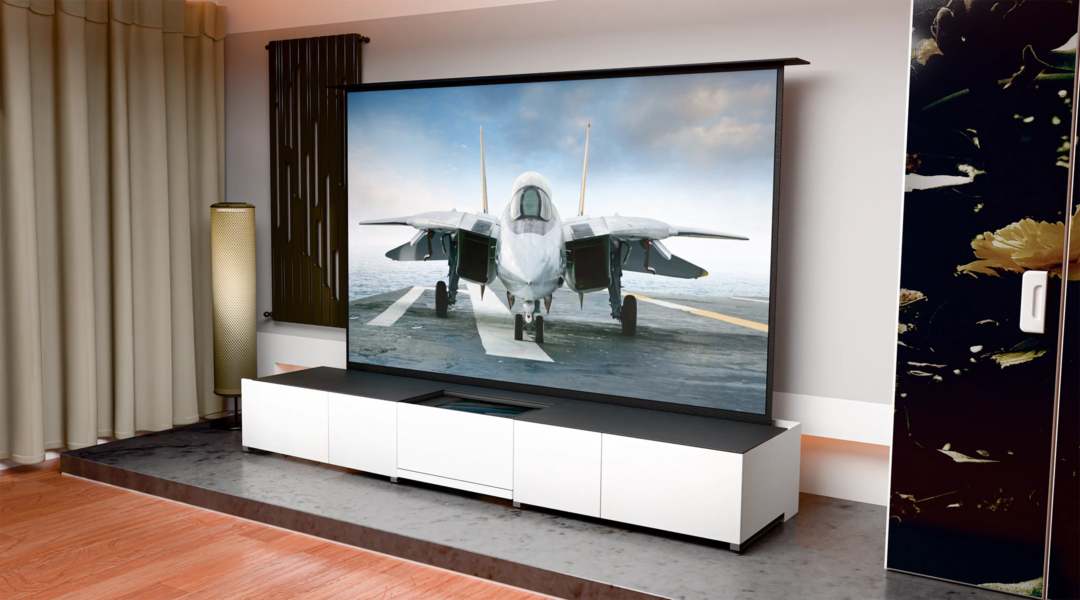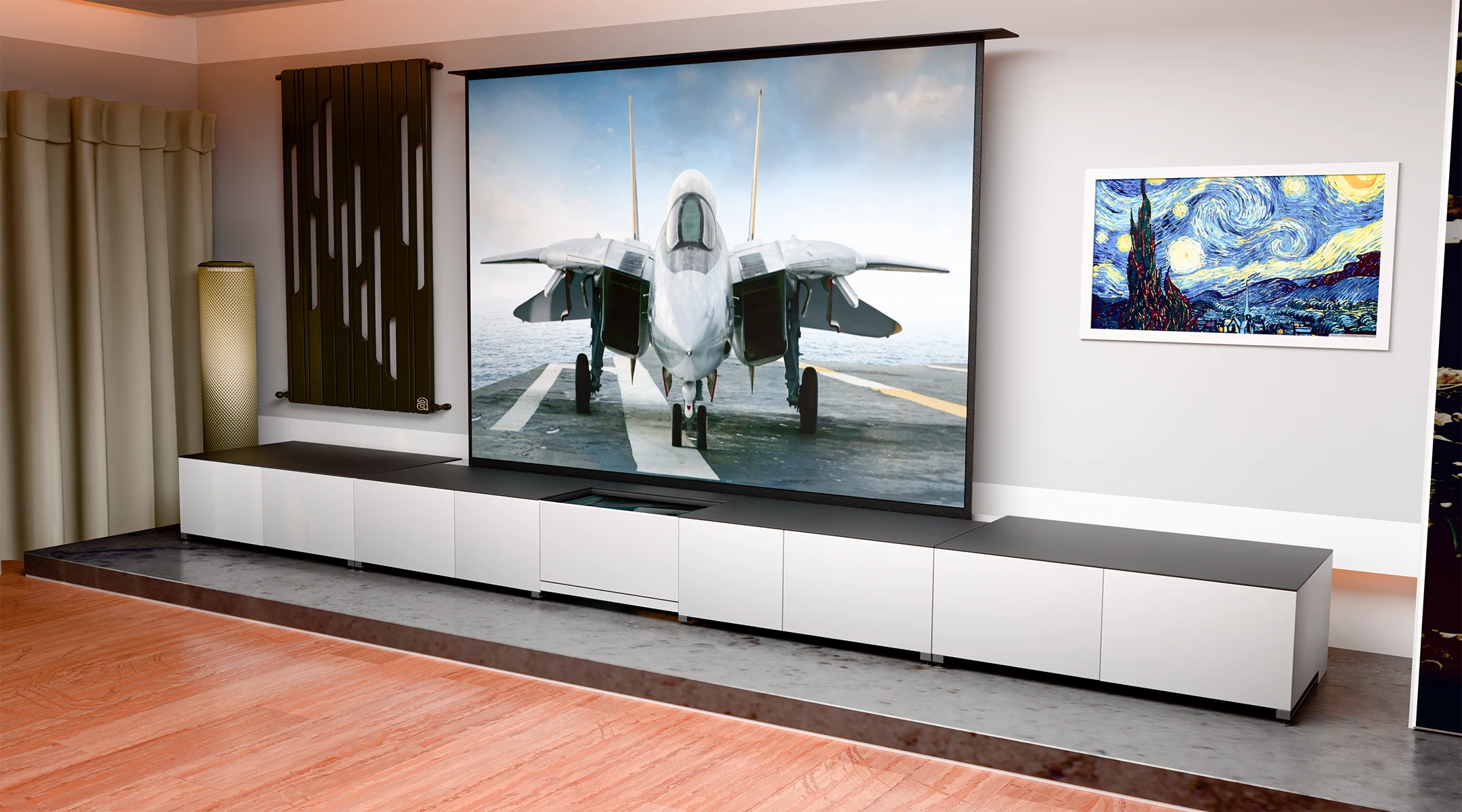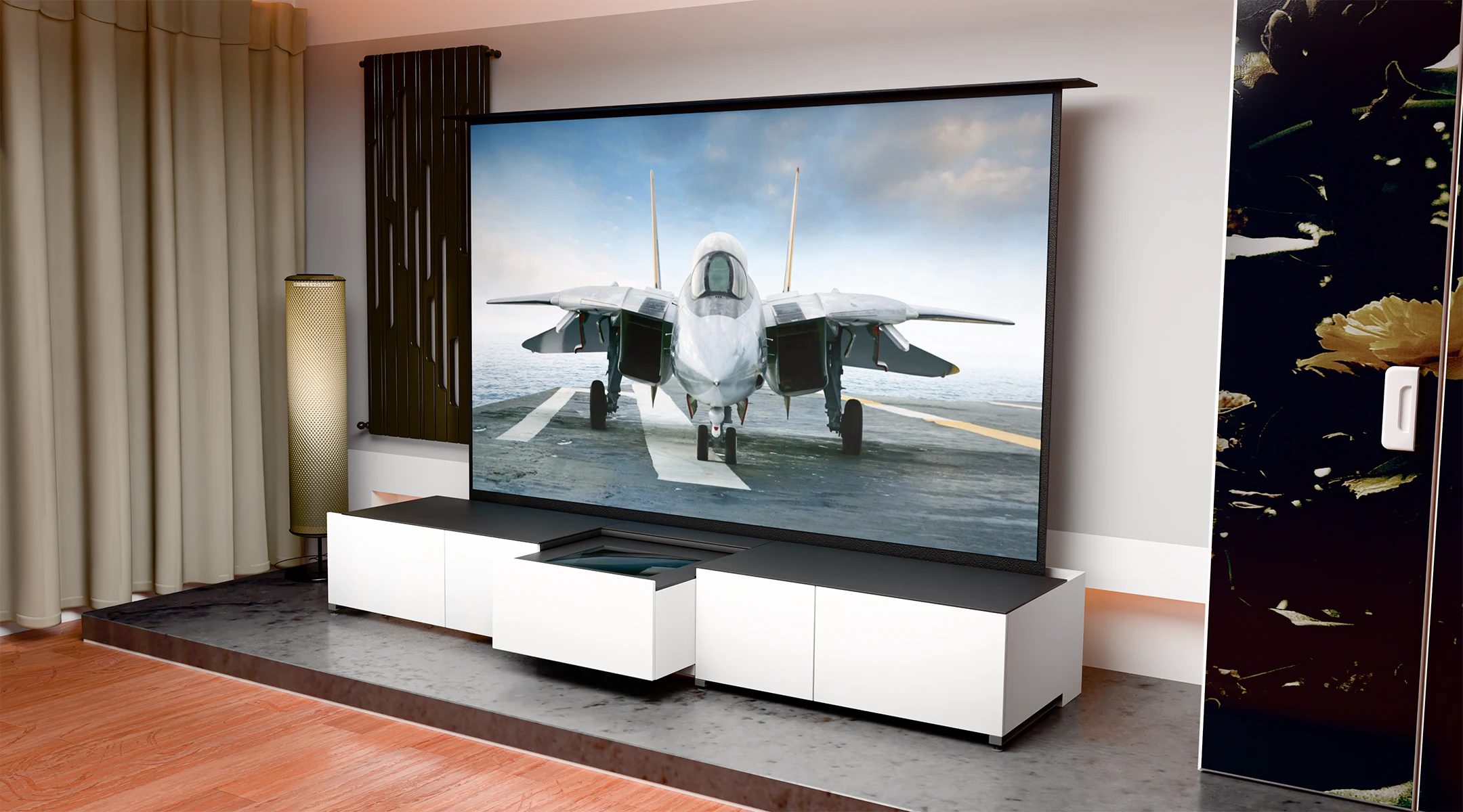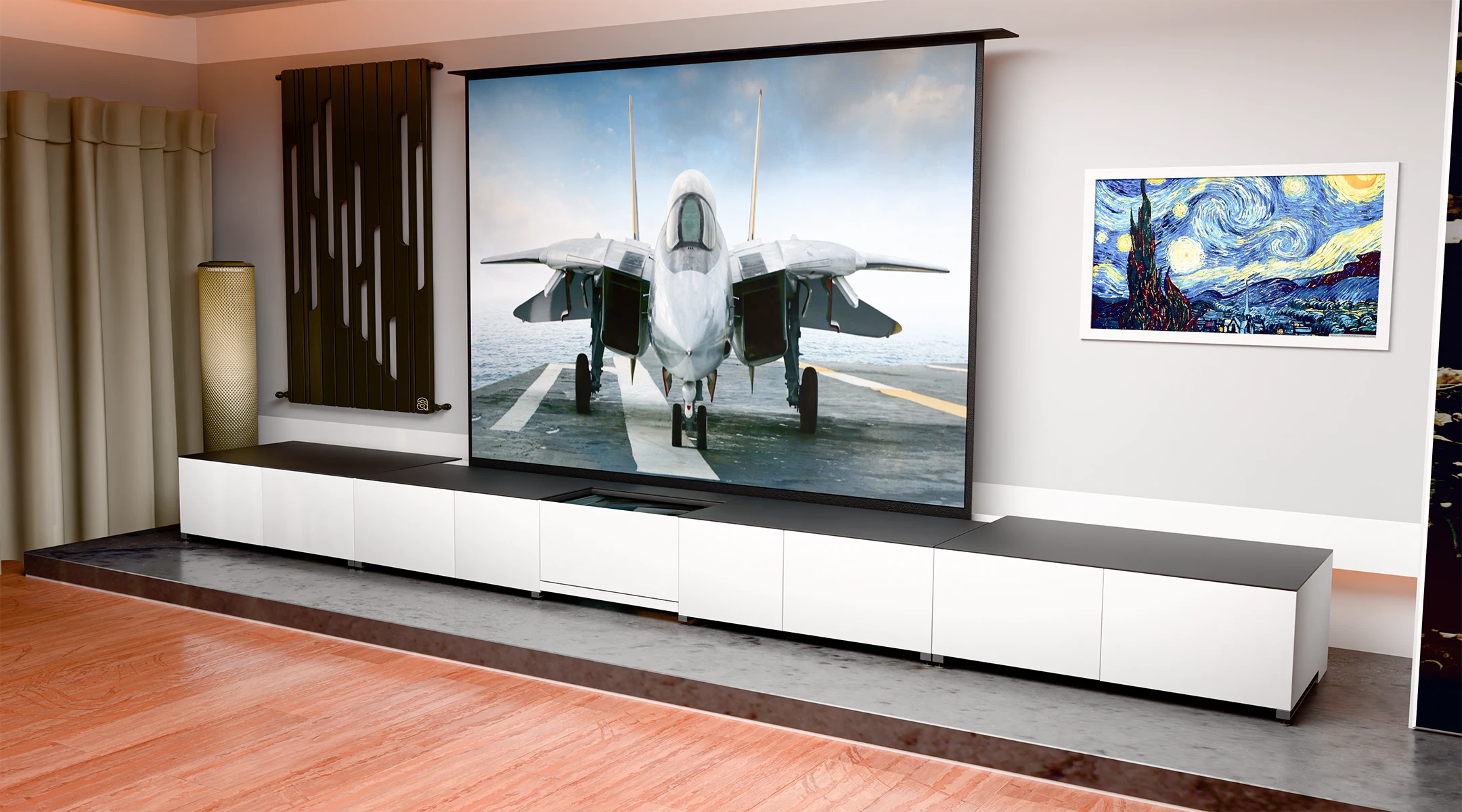 - Motorized Magic – A motorized projection screen appears from hidden compartments. This floor rising projector screen cabinet has a unique patent.